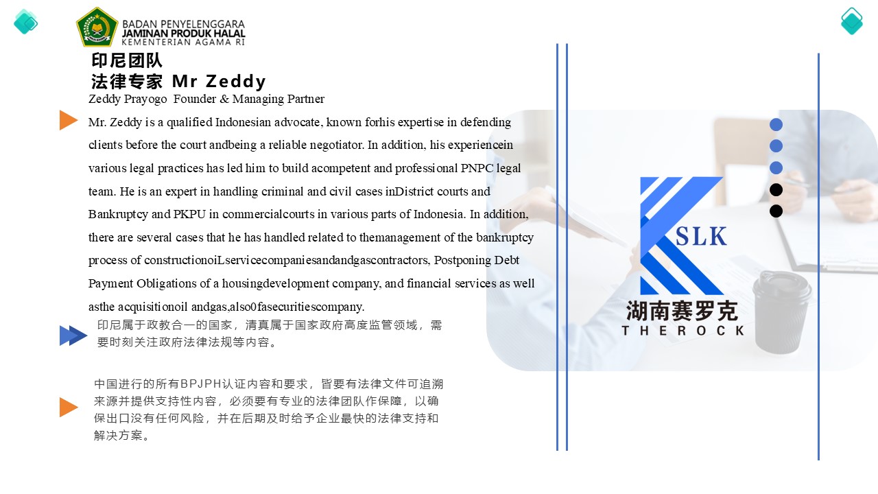 - 湖南赛罗克科技发展有限公司、湖南赛罗克检测技术有限公司、湖南赛罗克企业管理咨询有限公司,广东赛罗克国际认证有限公司,以上统称赛罗克认证公司,是专注印尼官方BPJPH,MUI, HALAL认证的专业认证机构和授权认证公司,自2023年起即为印尼BPJPH LPH surveyor指定的中国市场唯一代理商/指定合作方/指定办事处,明确拥有印尼BPJPH官方授权资质。
